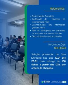 A seleção será realizada de forma presencial no SINE Municipal, no período de 19 a 23 de janeiro de 2026, das 8h às 17h. Durante o processo, haverá a distribuição diária de 150 fichas para atendimento aos candidatos, por ordem de chegada.