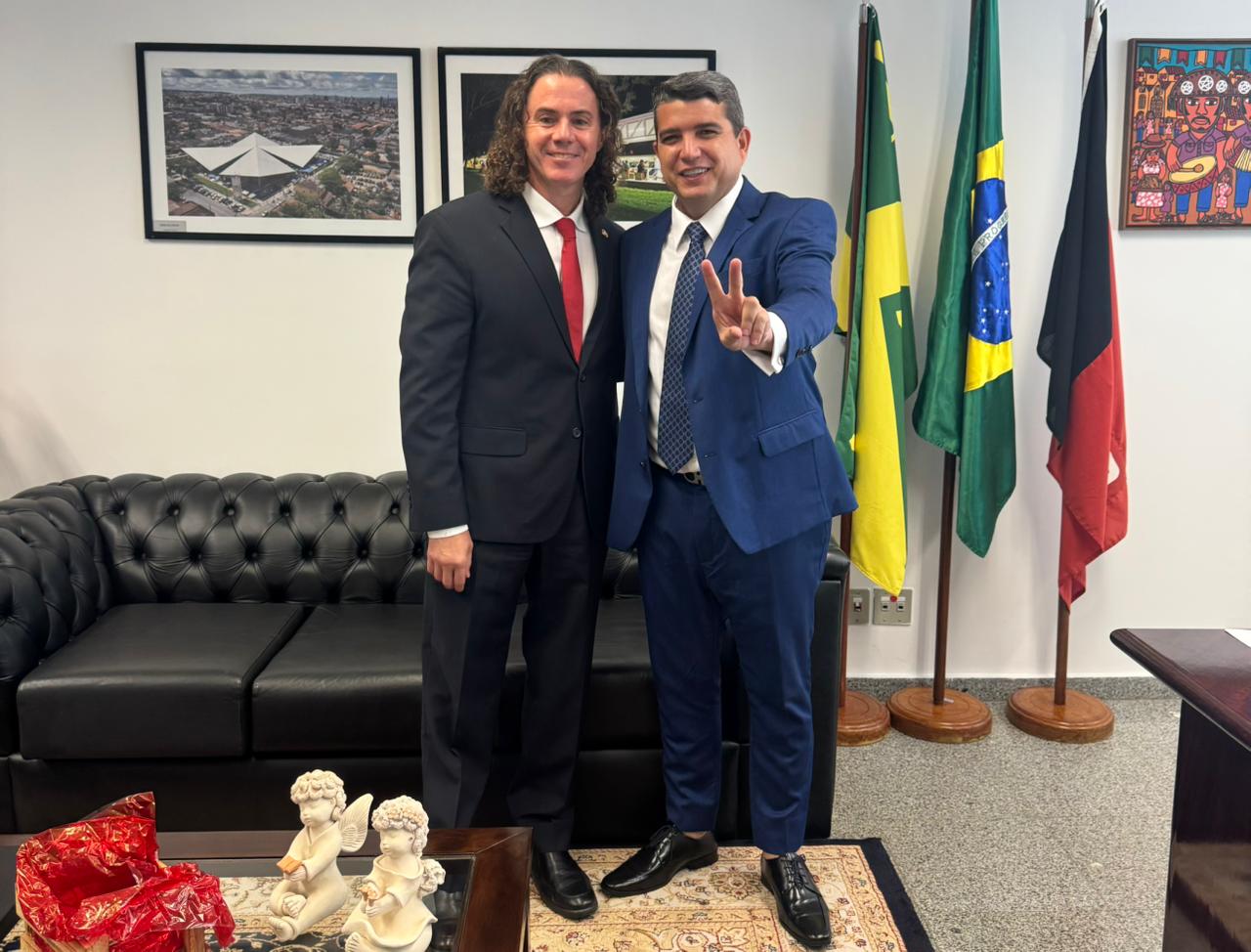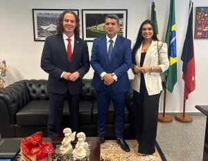 O Prefeito de São Bento, no sertão paraibano, Gerfeson Carnaúba, esteve no gabinete do Senador Veneziano Vital do Rêgo (MDB-PB), em Brasília, nesta terça-feira (17), acompanhado da sua esposa, a primeira-dama e Secretária Municipal de Assistência Social, Paloma Brilhante. Eles foram agradecer ações de Veneziano em favor da cidade, a exemplo da pavimentação de ruas que serão entregues em breve, e solicitar apoio para outras iniciativas, como recursos para pavimentar outras ruas e investimentos em Saúde.